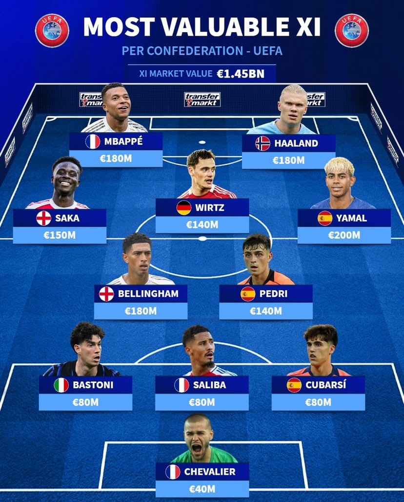 德转列欧洲最贵11人阵容:亚马尔领衔 哈兰德在列